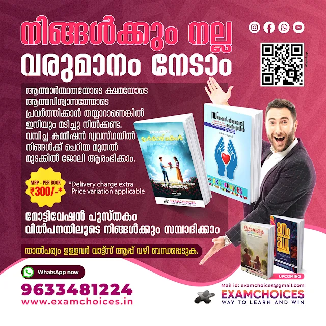 പ്രിയപ്പെട്ടവരേ Examchoices പ്രസിദ്ധികരിച്ചിരിക്കുന്ന മോട്ടിവേഷൻ പുസ്തകങ്ങളുടെ ഡിജിറ്റൽ വേർഷൻ ഇപ്പോൾ ഓരോന്നിനും കേവലം 100 രൂപക്ക് AMAZON KINDLE,GOOGLE BOOKS വഴി സ്വന്തമാക്കാം.വേഗമാകട്ടെ ഈ ഓഫർ ഇന്നത്തേക്ക് മാത്രം.ഈ വമ്പിച്ച അവസരം പാഴാക്കാതിരിക്കു.Buy now.